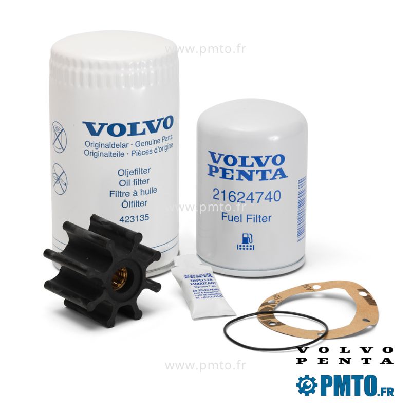Kit d’entretien courant pour moteurs diesel Volvo Penta KAD43, KAD44, KAMD43, KAMD44. Ce kit d’entretien Volvo Penta comprend un filtre à huile 423135, un filtre à carburant 21624740 et un kit impulseur 21951356.